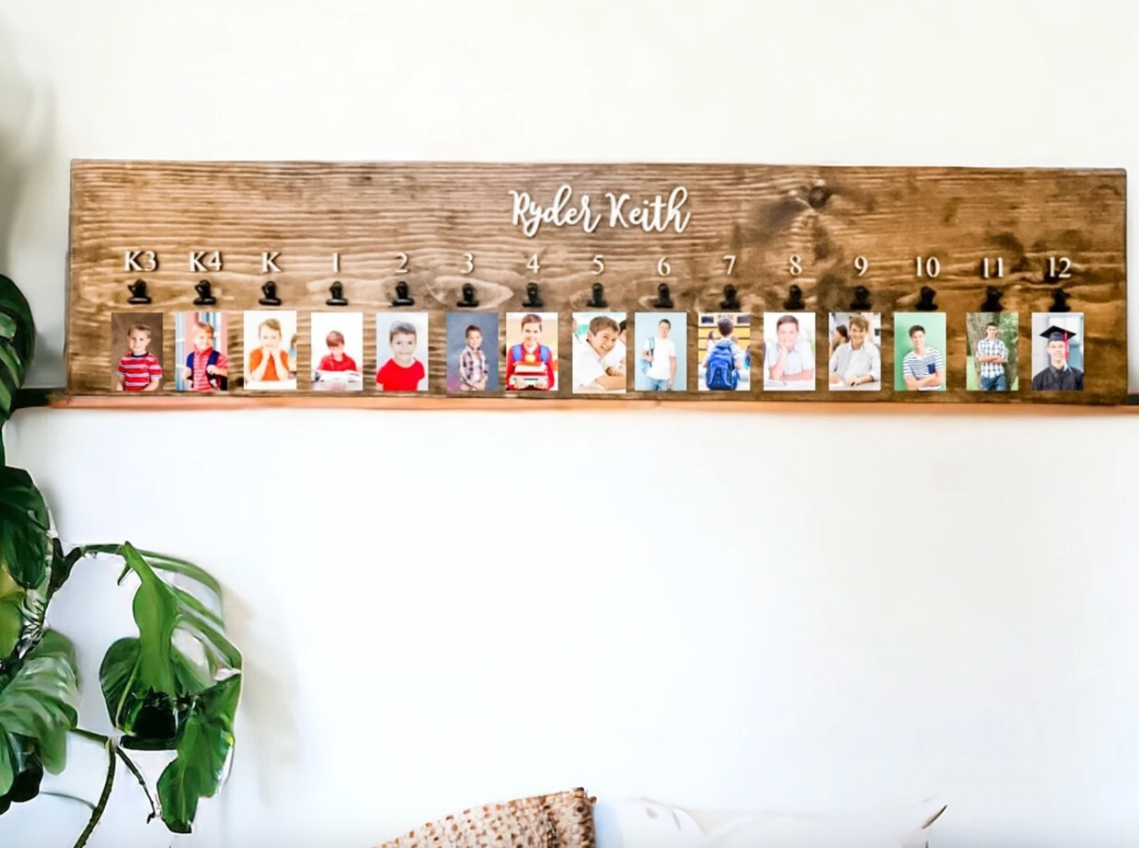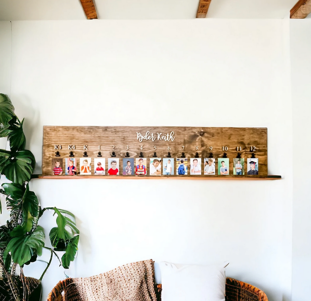 The perfect way to display your child's school photos throughout the years! This beautiful photo board will feature your child's name in script at the top and will feature up to 15 grades through their senior year! Choose your wood finish to coincide perfectly with your home's decor.