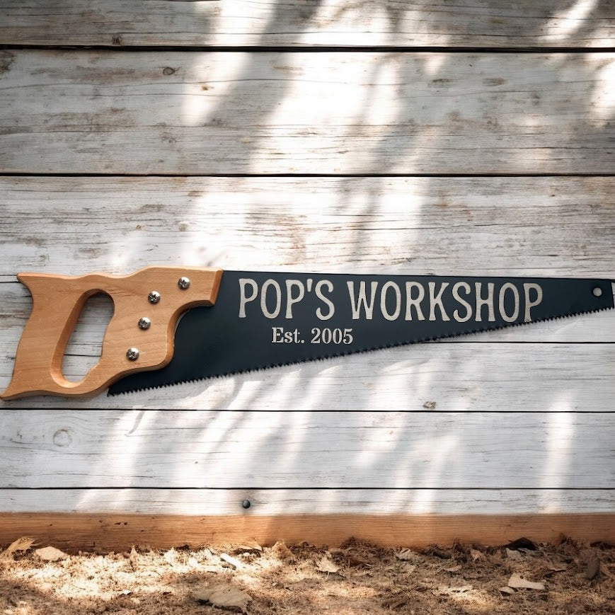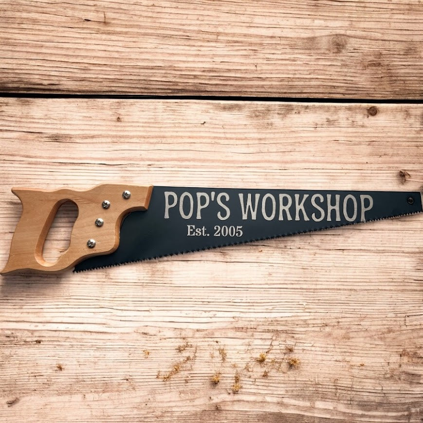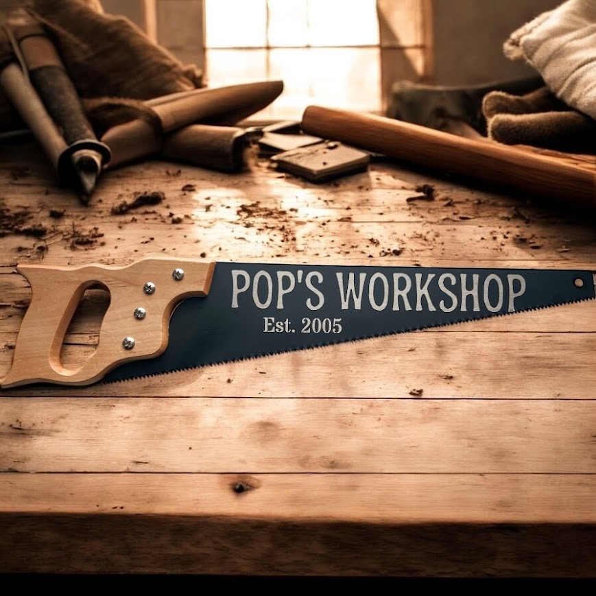 Turn his workshop into a one-of-a-kind space with our Custom Engraved Hand Saw. Designed for display only, this 18-inch real saw features a wooden handle, sharp-edged metal blade, and your custom engraving — whether it’s a name, workshop title, family name, or even a special quote. It's a unique gift for the man who loves his tools, but loves his story more.