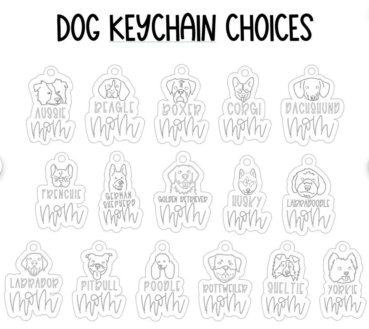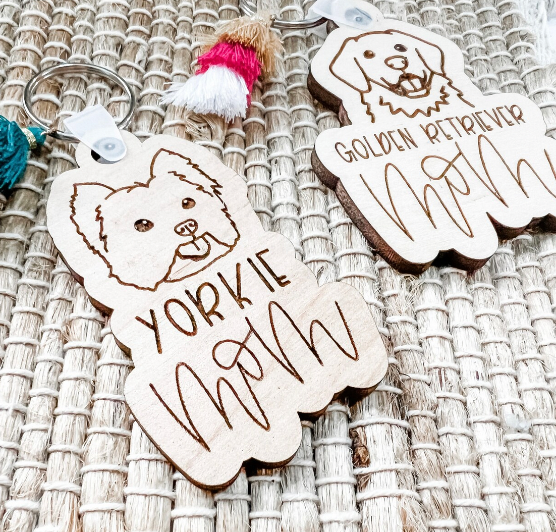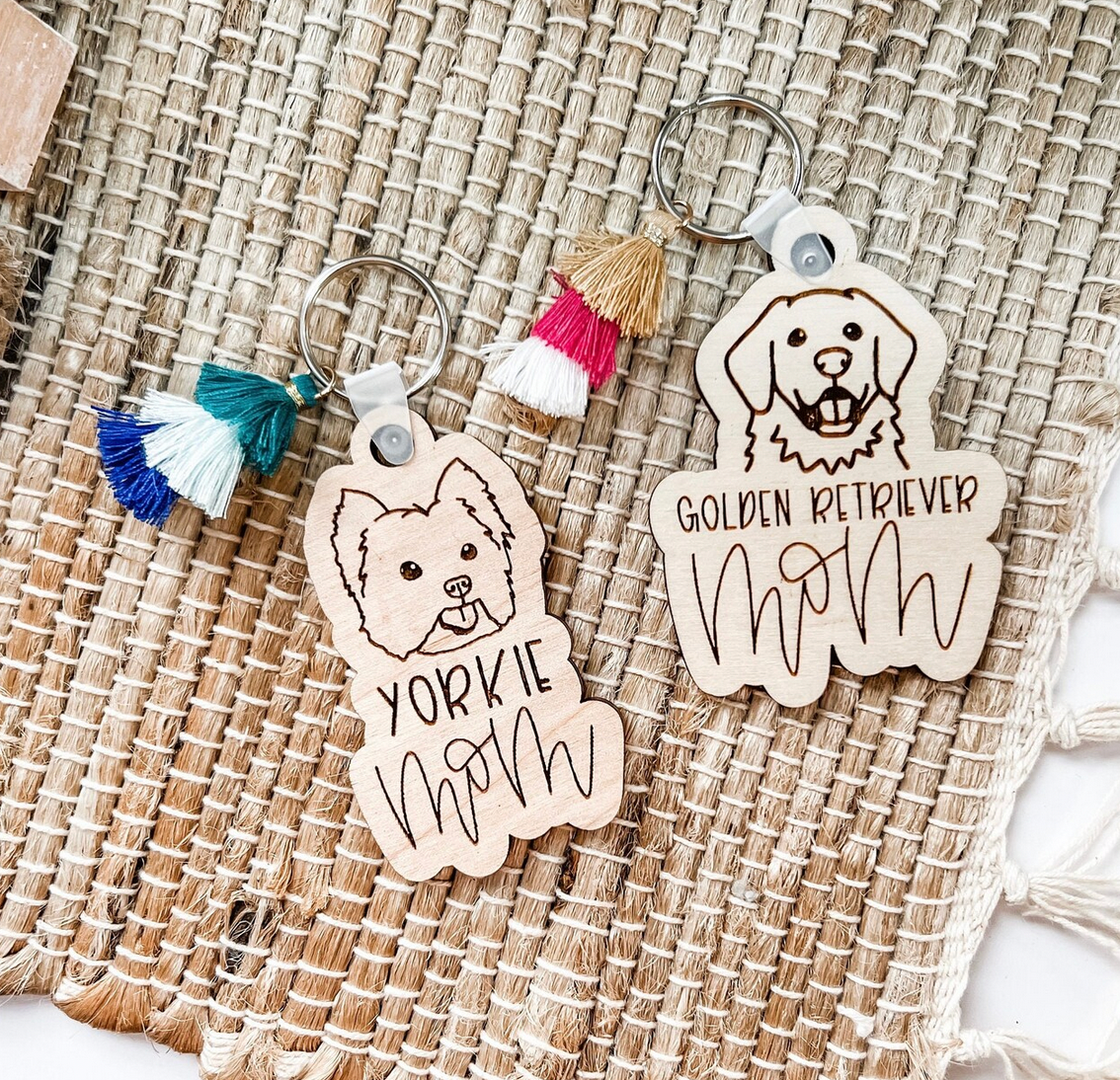 Celebrate your love for your furry friend with our beautifully crafted wooden Dog Mom keychains! Each keychain is a little over 3 inches tall and meticulously engraved with the silhouette of your favorite dog breed, along with the loving title "Dog Mom."