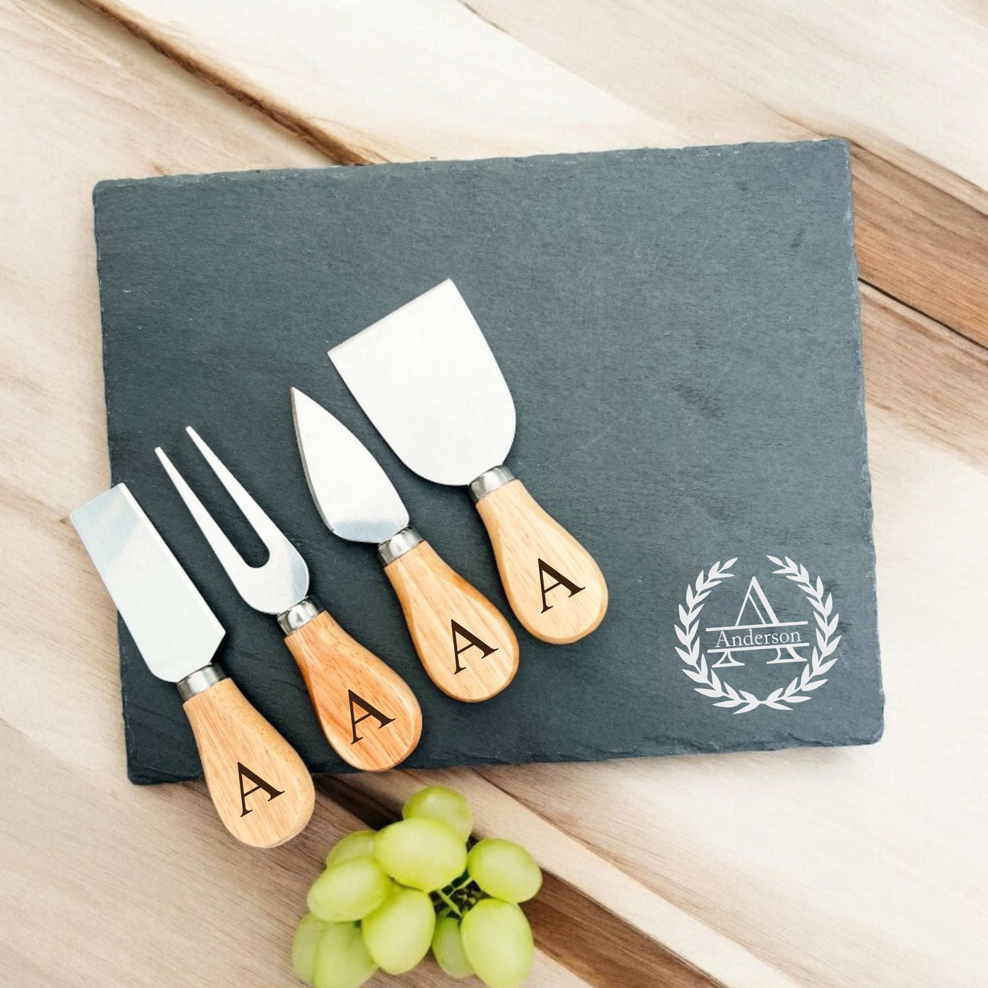 Take your gift to the next level by adding our 4-piece stainless steel cheese knife set with wood handles—each engraved with the matching initial for a cohesive, elegant look. These make it easy to serve up everything from soft brie to sharp cheddar in style.